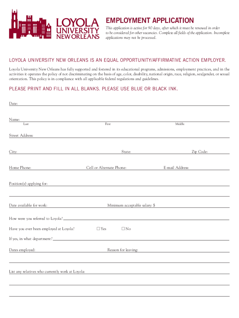 EMPLOYMENT APPLICATION This application is active for 90 days, after which it must be renewed in order to be considered for other vacancies. Complete all fields of the application. Incomplete applications