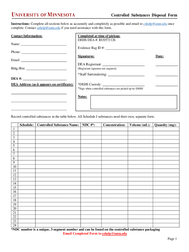 Controlled Substances Disposal Form Instructions: Complete all sections below as accurately and completely as possible and email to cshelp@umn.edu once complete. Contact cshelp@umn.edu if you need