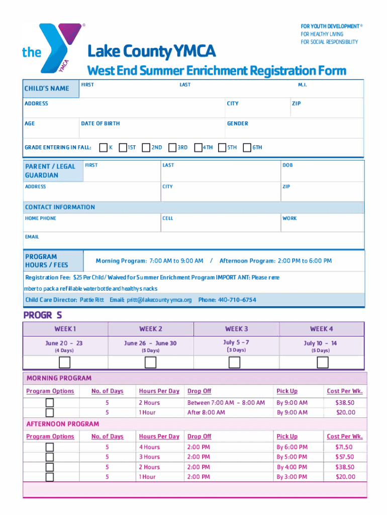 FOR SOCIAL RESPONSIBILITYLake County YMCA West End Summer Enrichment Registration Orchid\'S NAMEIFIRSTLASTM. I.ADDRESSCITYZIP