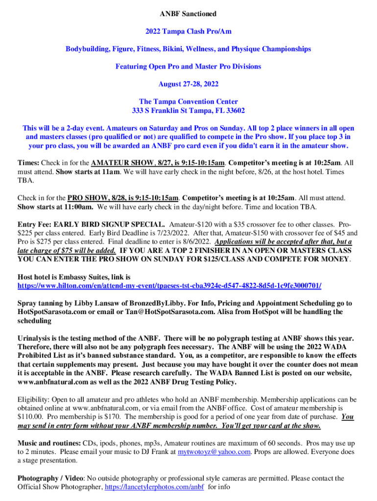 ABF Sanctioned 2022 Tampa Clash Pro/Am Bodybuilding, Figure, Fitness, Bikini, Wellness, and Physique Championships Featuring Open Pro and Master Pro Divisions August 2728, 2022 The Tampa Convention