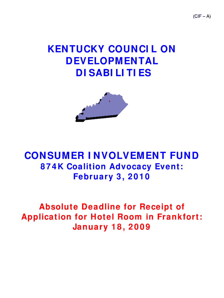 (CIF A) KENTUCKY COUNCIL ON DEVELOPMENTAL DISABILITIES CONSUMER INVOLVEMENT FUND 874K Coalition Advocacy Event: February 3, 2010, Absolute Deadline for Receipt of Application for Hotel Room in Frankfort: