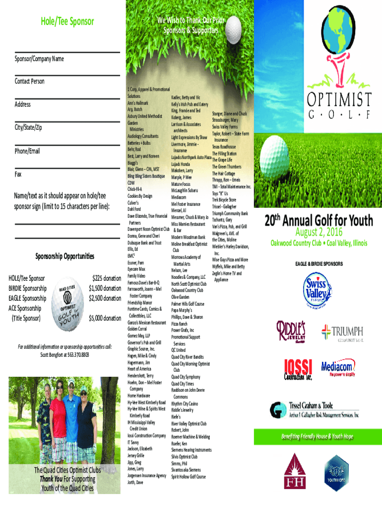 Hole/Tee Sponsored Wish to Thank Our Prior Sponsors & SupportersSponsor/Company Name Contact Person 1 Corp, Apparel & Promotional Solutions Adler, Betty and Vic Ann's Hallmark Kelly's Irish Pub and