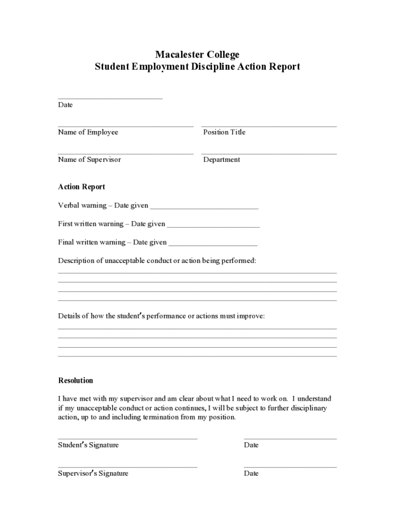 McAlister College Student Employment Discipline Action Report ___ Date ___ Name of Employee___ Position Title___ Name of Supervisor___ DepartmentAction Report Verbal warning Date given ___ First written