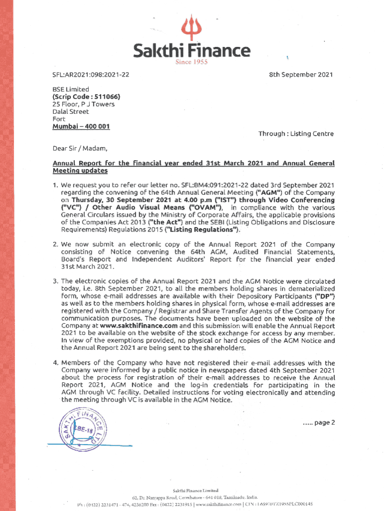 Saatchi Finance Since 1958th September 2021SFL:AR2021:098:202122 BSE Limited (Scrip Code : 511066) 25 Floor, P J Towers Dalai Street Fort Mumbai 400 001Through: Listing Center Dear Sir / Madam, Annual