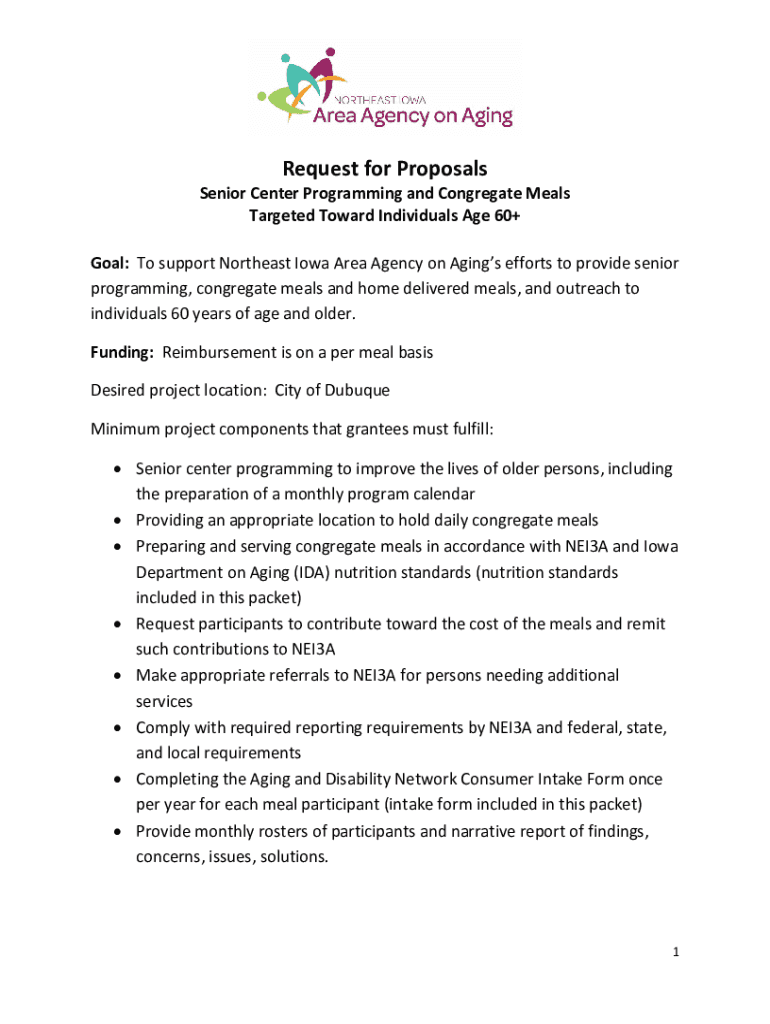 Request for Proposals Senior Center Programming and Congregate Meals Targeted Toward Individuals Age 60+ Goal: To support Northeast Iowa Area Agency on Agings efforts to provide senior programming,