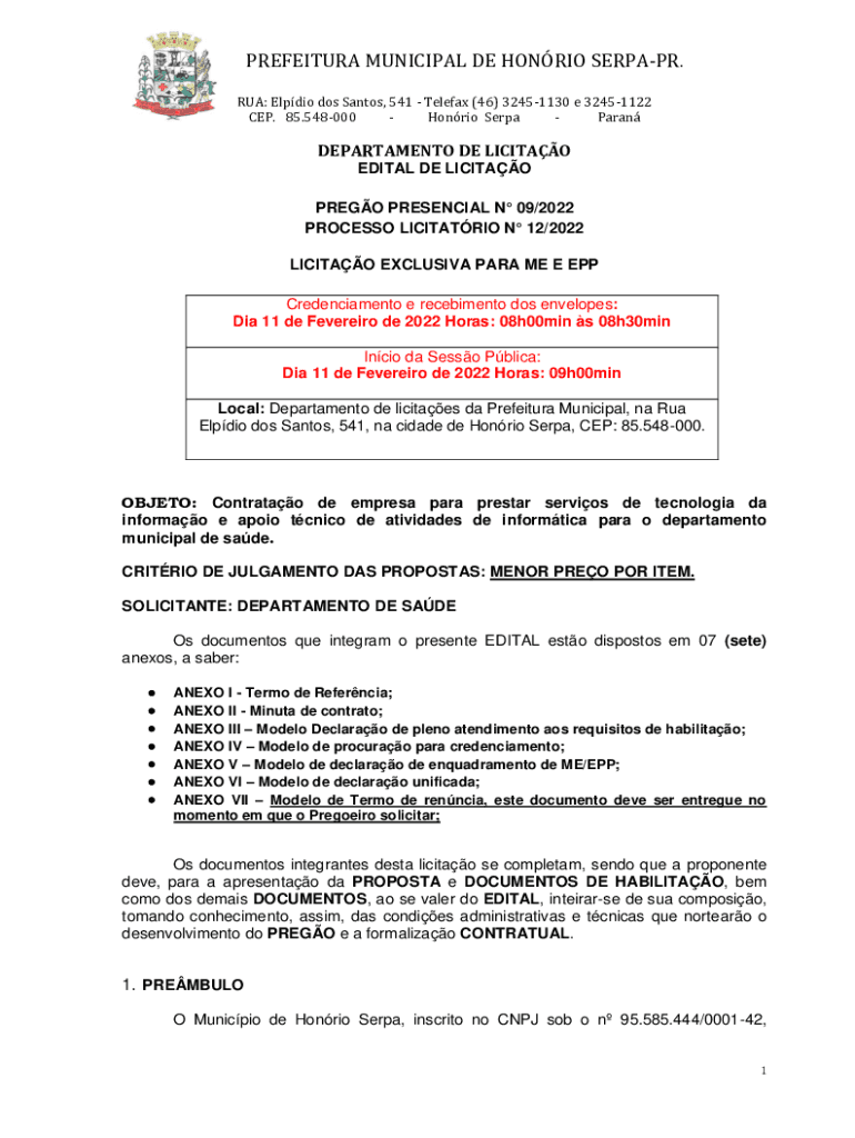 Obtenha o gratuito PREFEITURA MUNICIPAL DE HONRIO SERPA-PR.