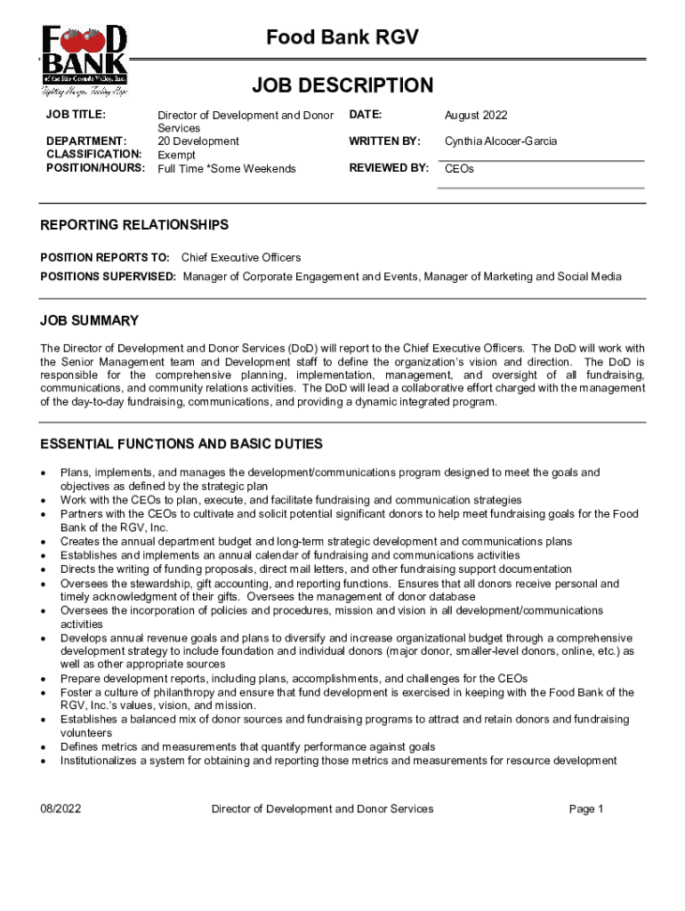 Food Bank REV JOB DESCRIPTION JOB TITLE: DEPARTMENT: CLASSIFICATION: POSITION/HOURS:Director of Development and Donor Services 20 Development Exempt Full Time *Some WeekendsDATE:August 2022WRITTEN