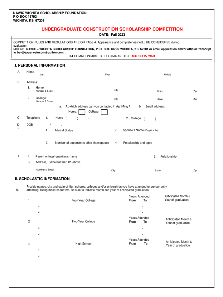 NARIC WICHITA SCHOLARSHIP FOUNDATION P O BOX 48793 WICHITA, KS 67201UNDERGRADUATE CONSTRUCTION SCHOLARSHIP COMPETITION DATE: Fall 2023 APPLICANT: Please complete ALL sections of this application.