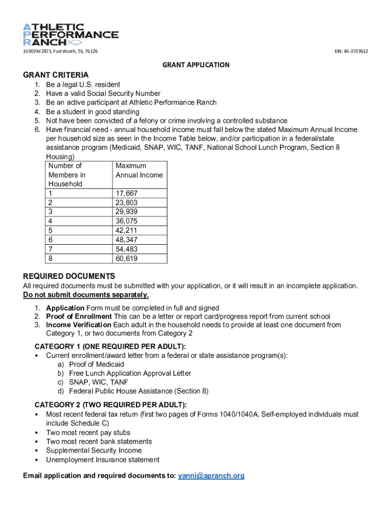 1590 FM 2871, Fort Worth, TX, 76126GRANT CRITERIA 1. 2. 3. 4. 5. 6.EIN: 463739612GRANT APPLICATION Be a legal U.S. resident Have a valid Social Security Number Be an active participant at Athletic