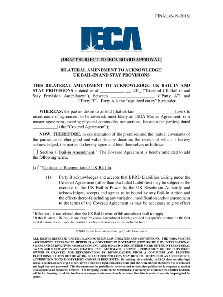 FINAL (6192018)[DRAFT SUBJECT TO IECA BOARD APPROVAL] BILATERAL AMENDMENT TO ACKNOWLEDGE: UK BAILING AND STAY PROVISIONS THIS BILATERAL AMENDMENT TO ACKNOWLEDGE: UK BAILING AND STAY PROVISIONS is