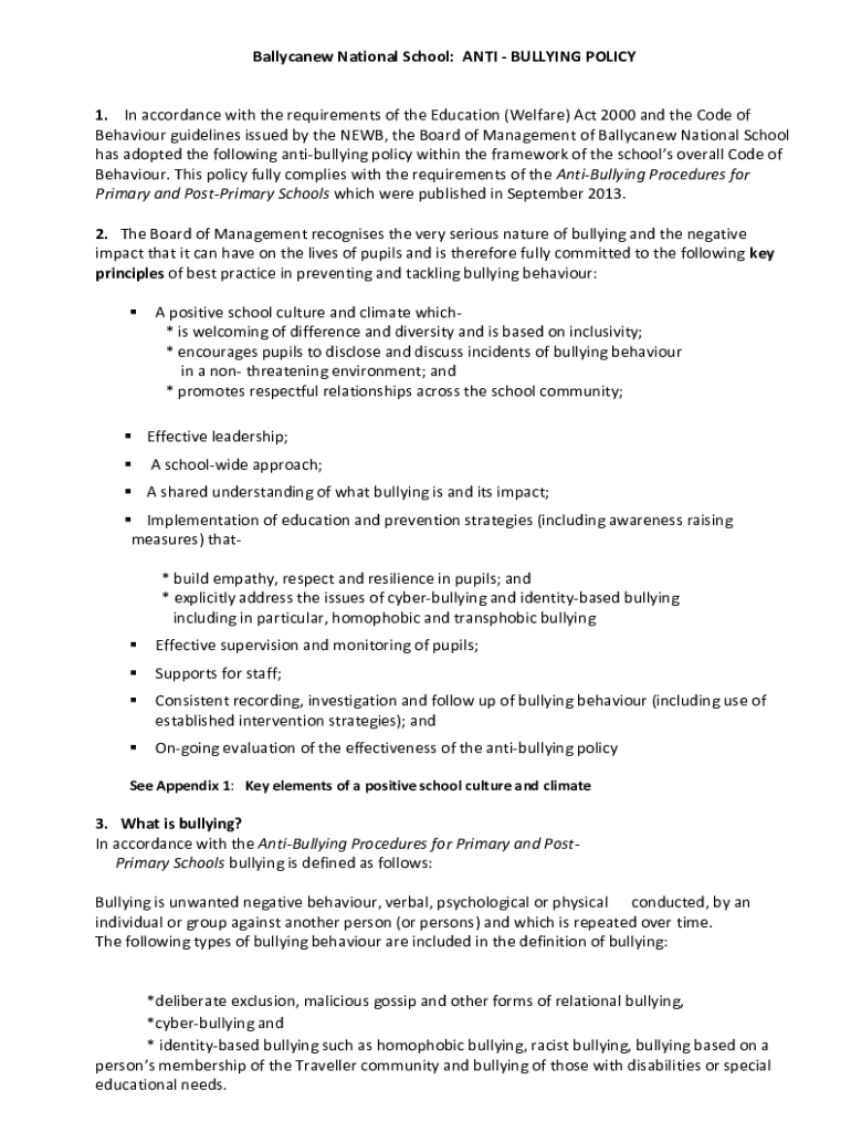 Billycan National School: ANTI BULLYING POLICY1. In accordance with the requirements of the Education (Welfare) Act 2000 and the Code of Behavior guidelines issued by the NEW, the Board of Management