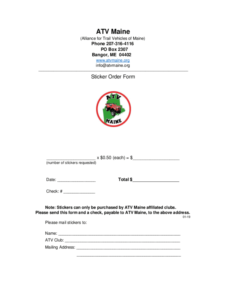 ATV Maine (Alliance for Trail Vehicles of Maine)Phone 2073164116 PO Box 2307 Bangor, ME 04402 www.atvmaine.org info@atvmaine.org ___Sticker Order Form___ x $0.50 (each) $___ (number of stickers requested)Date: