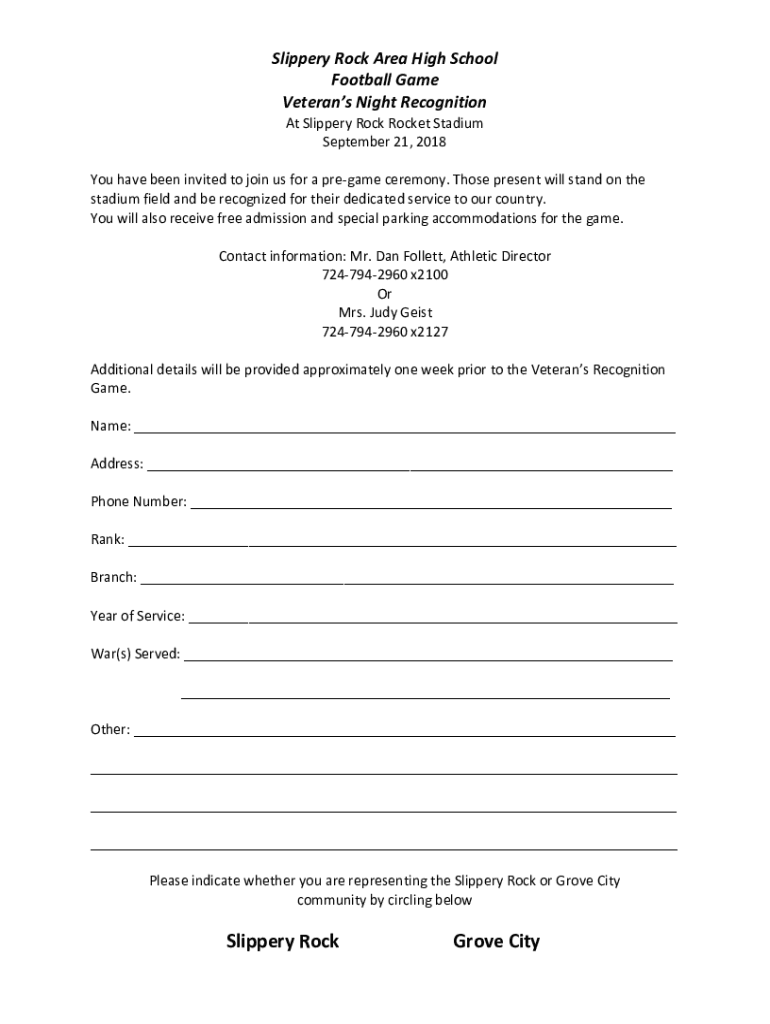 Slippery Rock Area High School Football Game Veterans Night Recognition At Slippery Rock Rocket Stadium September 21, 2018, You have been invited to join us for a pregame ceremony. Those present will