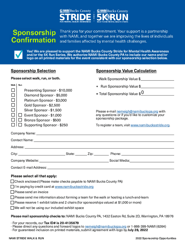 2022Bucks CountyBucks Countryside 5K RUN A ND FOR MENTAL HEALTH AWARENESSRACE TO END MENTAL HEALTH STIGMASPONSORSHIP OPPORTUNITIESNAMI Bucks County PA, your local affiliate of the National Alliance