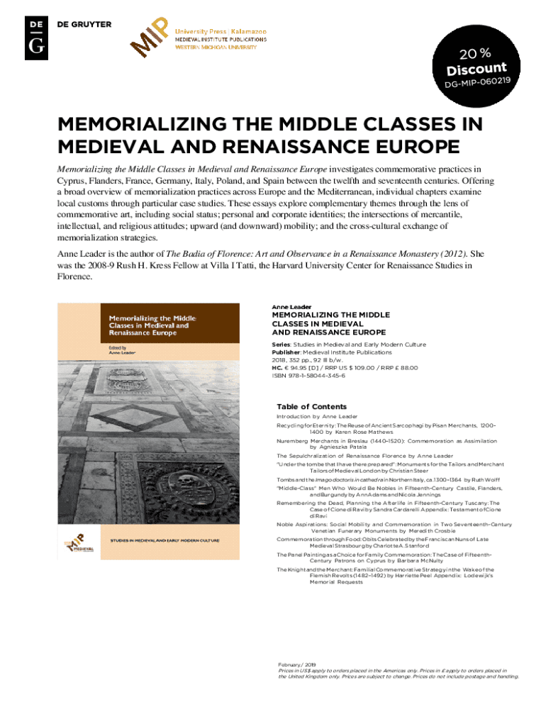 MEMORIALIZING THE MIDDLE CLASSES IN MEDIEVAL AND RENAISSANCE EUROPE Memorializing the Middle Classes in Medieval and Renaissance Europe investigates commemorative practices in Cyprus, Flanders, France,