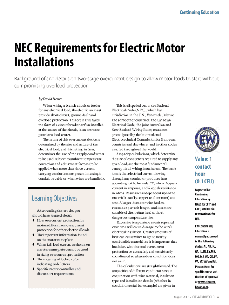 Continuing Education NEC Requirements for Electric Motor Installations Background of and details on two stage overcurrent design to allow motor loads to start without compromising overload protection