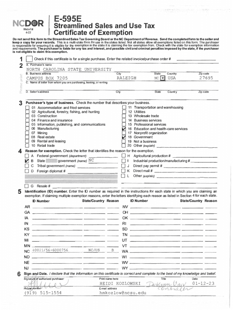 E595ENCDfRStreamlined Sales and Use Tax Certificate of ExemptionWebFill 422Do not send this form to the Streamlined Sales Tax Governing Board or the NC Department of Revenue. Send the completed form
