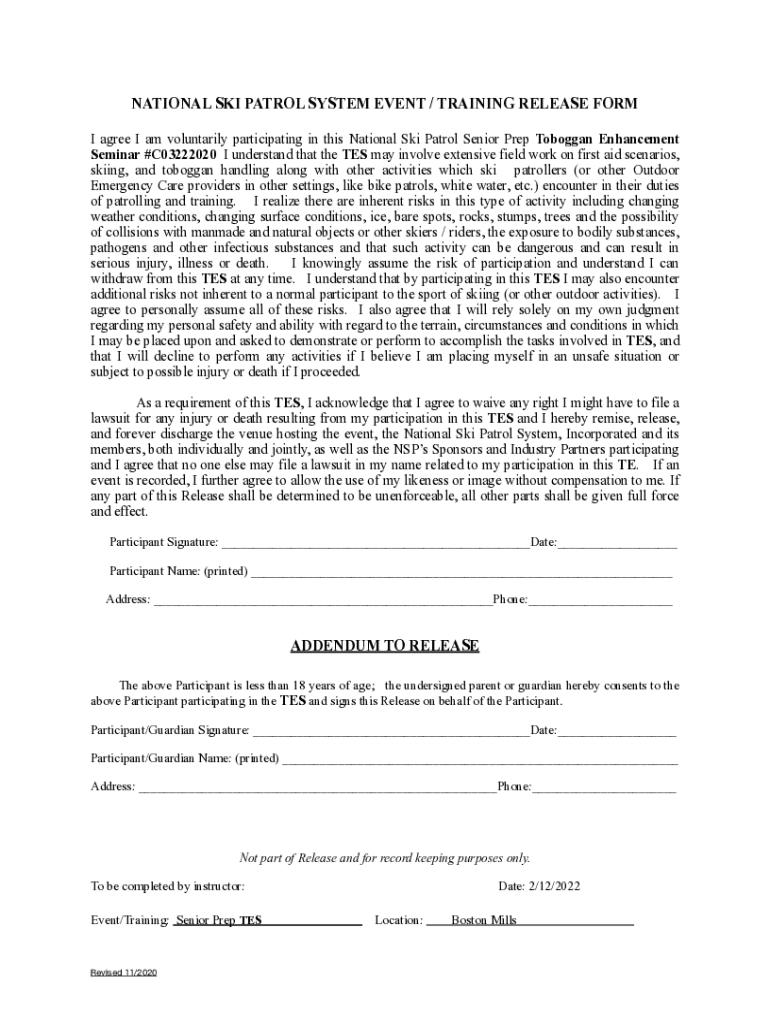 I agree I am voluntarily participating in this National Ski Patrol Senior Prep Toboggan Enhancement Seminar #C03222020 I understand that the TES may involve extensive field work on first aid scenarios,