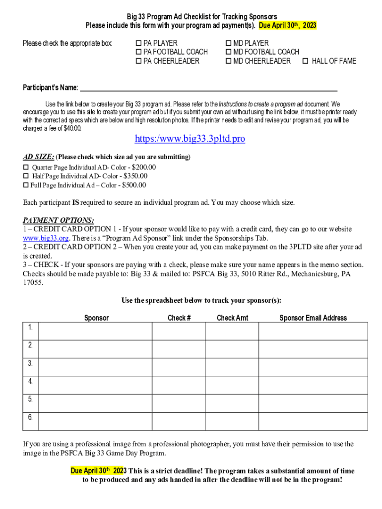 Big 33 Program Ad Checklist for Tracking Sponsors Please include this form with your program ad payment(s). Due April 30th, 2023 Please check the appropriate box:o PA PLAYER o PA FOOTBALL COACH o