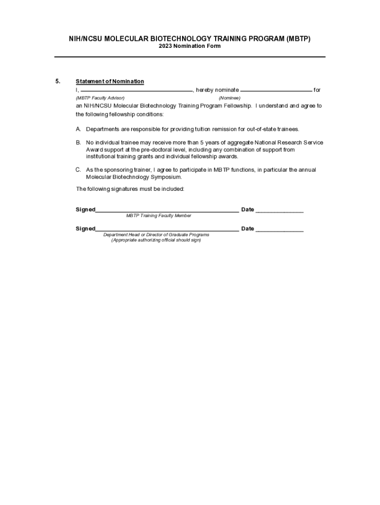 NIH/CSU MOLECULAR BIOTECHNOLOGY TRAINING PROGRAM (MBT) 2023 Nomination Form5. Statement of Nomination I, hereby nominate(MBT Faculty Advisor)for(Nominee)an NIH/CSU Molecular Biotechnology Training