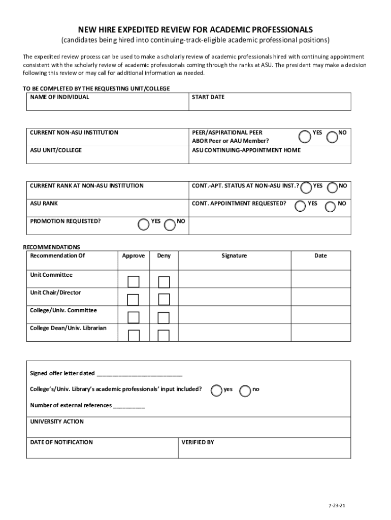 NEW HIRE EXPEDITED REVIEW FOR ACADEMIC PROFESSIONALS(candidates being hired into continuingtrackeligible academic professional positions) The expedited review process can be used to make a scholarly