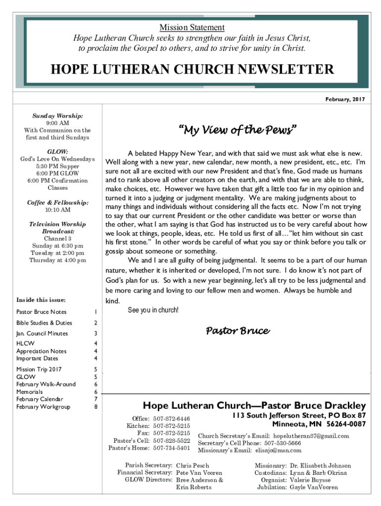 Mission Statement Hope Lutheran Church seeks to strengthen our faith in Jesus Christ, to proclaim the Gospel to others, and to strive for unity in Christ. HOPE LUTHERAN CHURCH NEWSLETTER February,