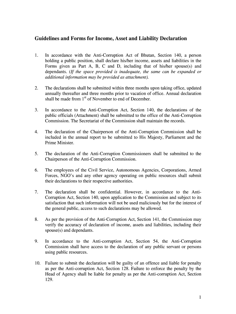 Guidelines and Forms for Income, Asset and Liability Declaration. 1. In accordance with the Anti-Corruption Act of Bhutan, Section 140, a person holding a public ...