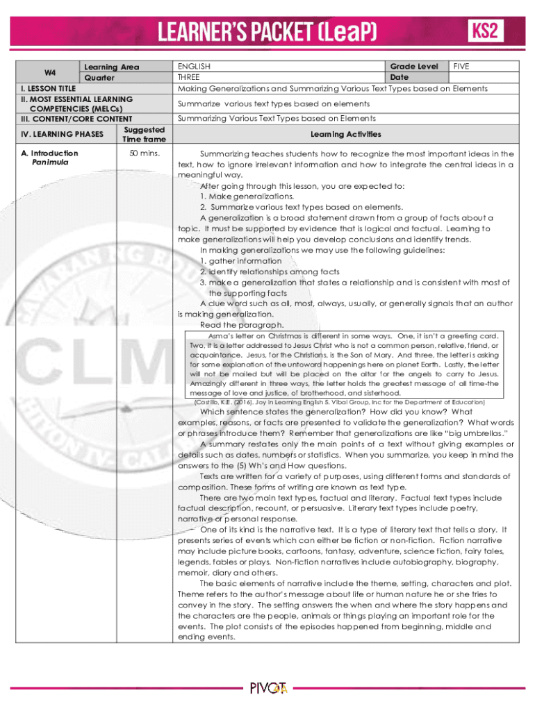 W4Learning Area Quarter. LESSON TITLE II. MOST ESSENTIAL LEARNING COMPETENCIES (Melts) III. CONTENT/CORE CONTENT Suggested IV. LEARNING PHASES Time frame A. Introduction Panimula50 mins. ENGLISH Grade