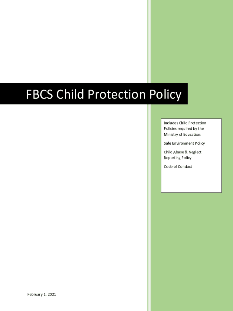 FBS Child Protection Policy Includes Child Protection Policies required by the Ministry of Education: Safe Environment Policy Child Abuse & Neglect Reporting Policy Code of Conduct February 1, 2021First