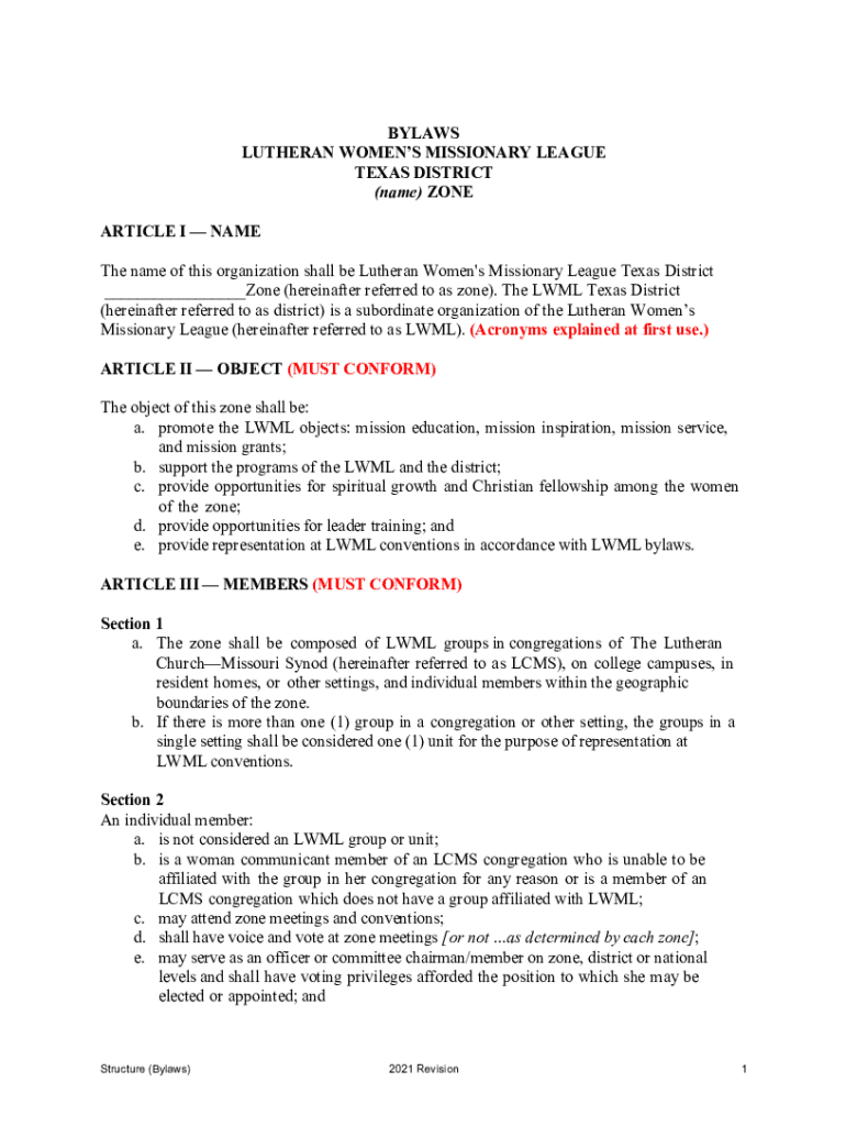BYLAWS LUTHERAN WOMEN MISSIONARY LEAGUE TEXAS DISTRICT (name) ZONE ARTICLE I NAME The name of this organization shall be Lutheran Women\'s Missionary League Texas District ___Zone (hereinafter referred