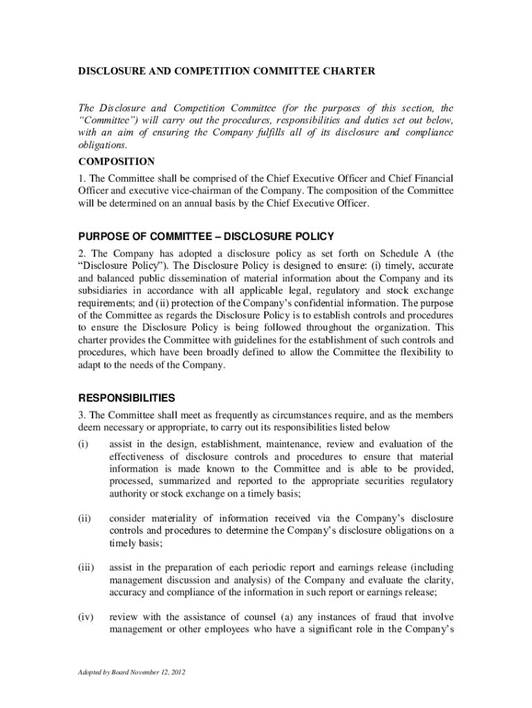 DISCLOSURE AND COMPETITION COMMITTEE CHARTER The Disclosure and Competition Committee (for the purposes of this section, the Committee) will carry out the procedures, responsibilities and duties set