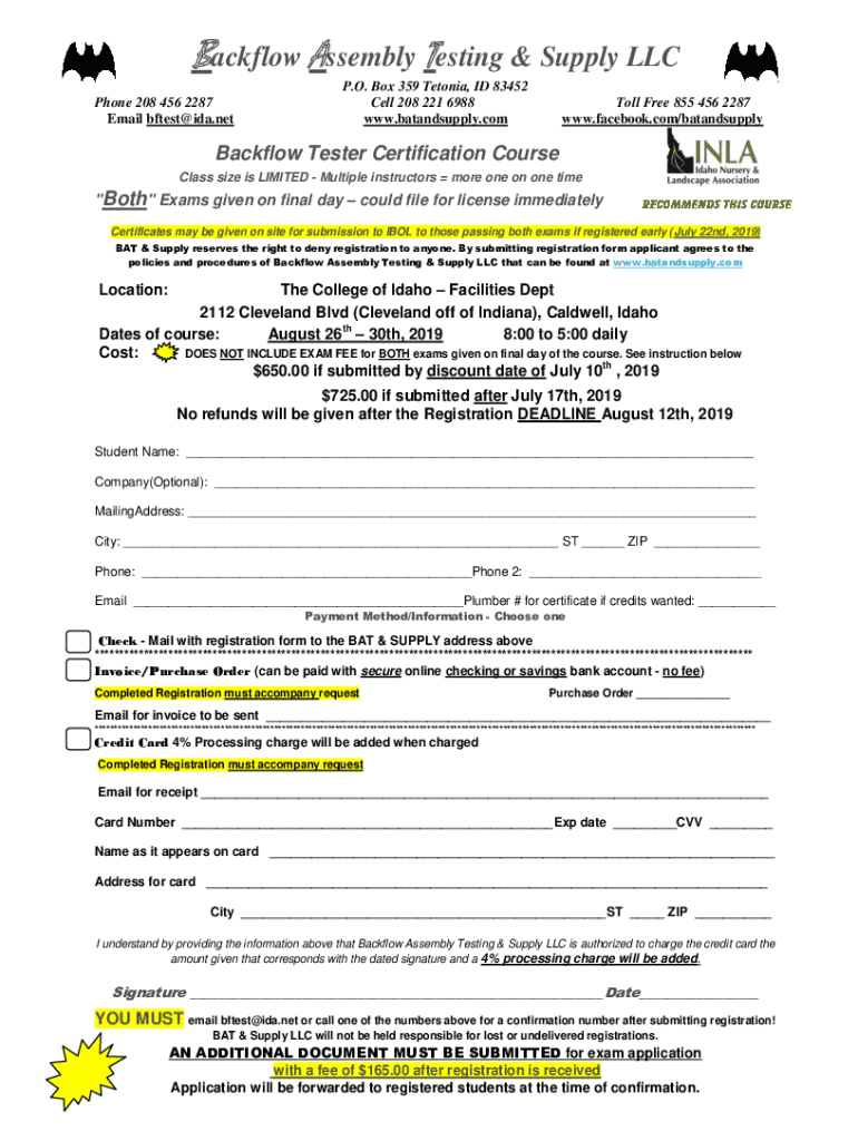 Backflow Assembly Testing & Supply LLC Phone 208 456 2287 Email bftest@ida.netP. O. Box 359 Estonia, ID 83452 Cell 208 221 6988 www.batandsupply.comToll Free 855 456 2287 www.facebook.com/batandsupplyBackflow