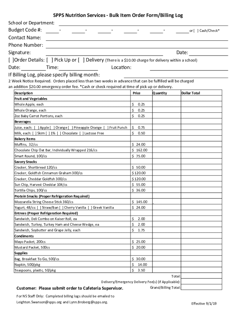 SPAS Nutrition Services Bulk Item Order Form/Billing Log School or Department:Budget Code #: or [ ] Cash/Check* Contact Name: Phone Number: Signature: Date: [ ]Order Details: [ ] Pick Up or [ ] Delivery