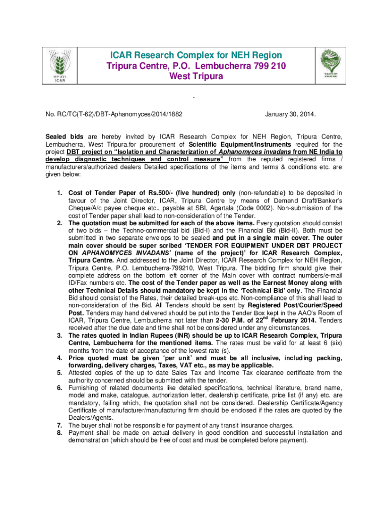 CAR Research Complex for NEH Region Tripura Center, P.O. Lembucherra 799 210 West Tripura. No. RC/TC(T62)/DBTAphanomyces/2014/1882January 30, 2014. Sealed bids are hereby invited by CAR Research Complex