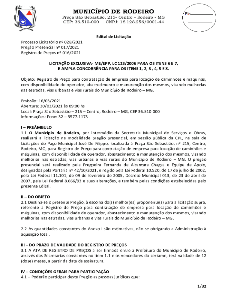 MUNICIPAL DE RODEO Prey So Sebastian, 215 CENTR Radar MG CEP: 36.510000 CNJ: 18.128.256/000144Edital de Licit Process Limitation n 028/2021 PRESO Presence n 017/2021 Registry de Preos n 016/2021 LICIT