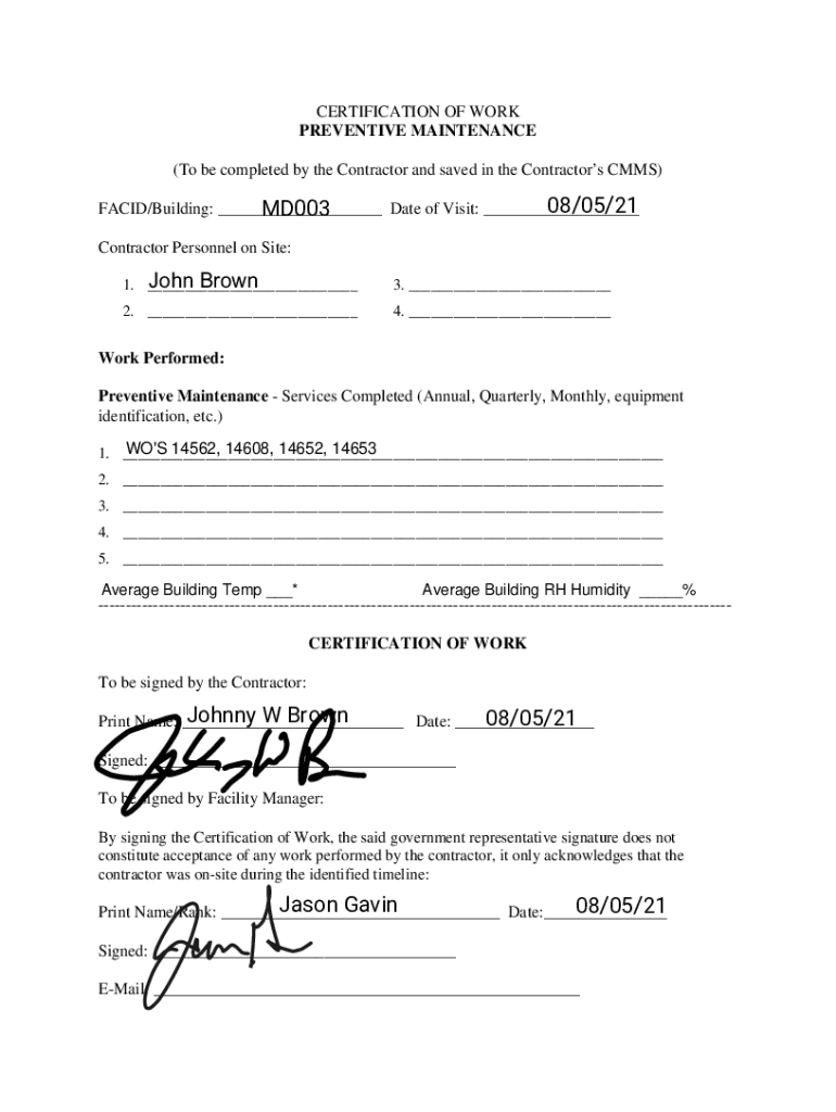 CERTIFICATION OF WORK PREVENTIVE MAINTENANCE (To be completed by the Contractor and saved in the Contractors CMOS)08/05/21 ACID/Building: ___ Date of Visit: ___ MD003 Contractor Personnel on Site:John