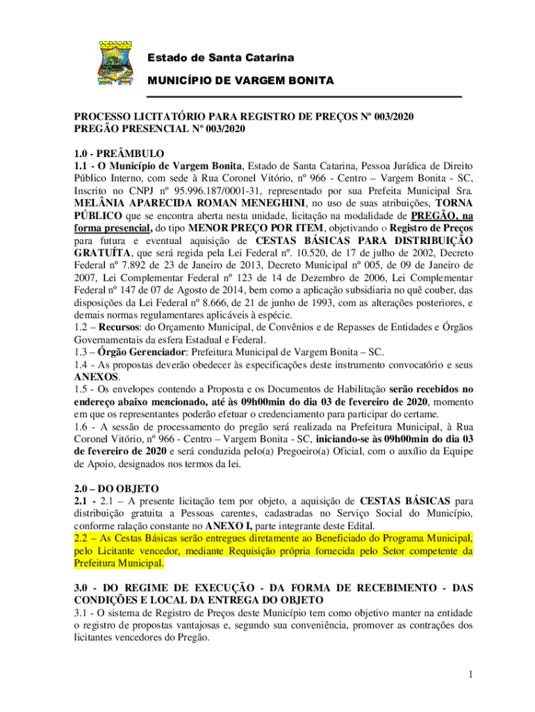 Est ado de Santa Catarina MUNICIPAL DE VAR GEM BONITA PROCESS LIMITATION PARA REGISTRY DE PRESS N 003/2020 PRESO PRESENCE N 003/2020 1.0 PREMIUM 1.1 O Municipal de Vargem Bonita, Est ado de Santa