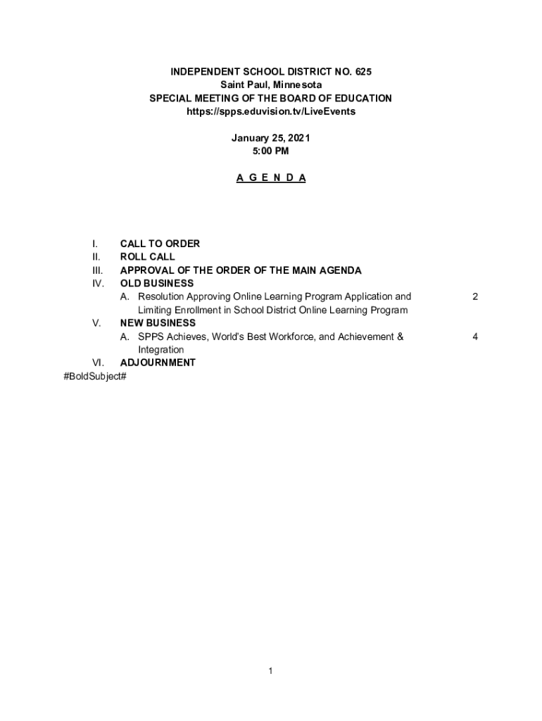 INDEPENDENT SCHOOL DISTRICT NO. 625 Saint Paul, Minnesota SPECIAL MEETING OF THE BOARD OF EDUCATION https://spps.eduvision.tv/LiveEvents January 25, 2021 5:00 PM A G E N D AI. II. III. IV.CALL TO