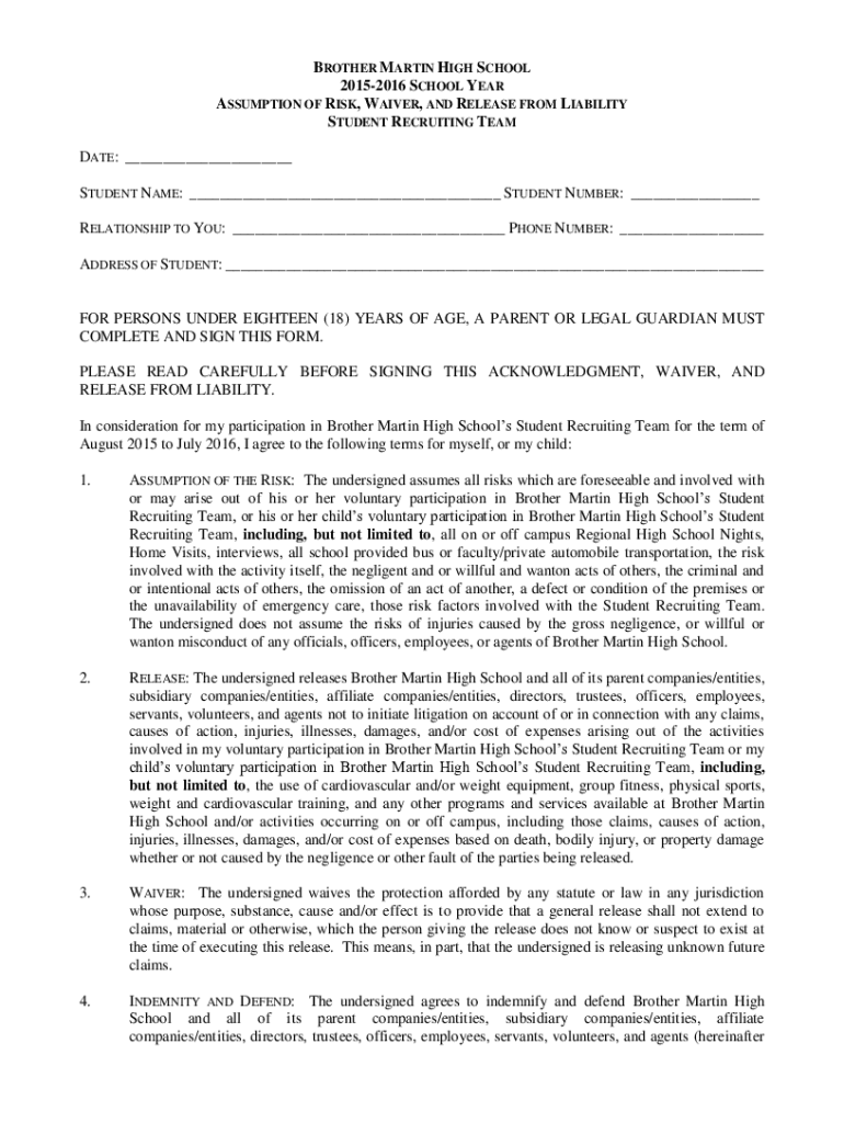 BROTHER MARTIN HIGH SCHOOL 20152016 SCHOOL YEAR ASSUMPTION OF RISK, WAIVER, AND RELEASE FROM LIABILITY STUDENT RECRUITING TEAM DATE: ___ STUDENT NAME: ___ STUDENT NUMBER: ___ RELATIONSHIP TO YOU: