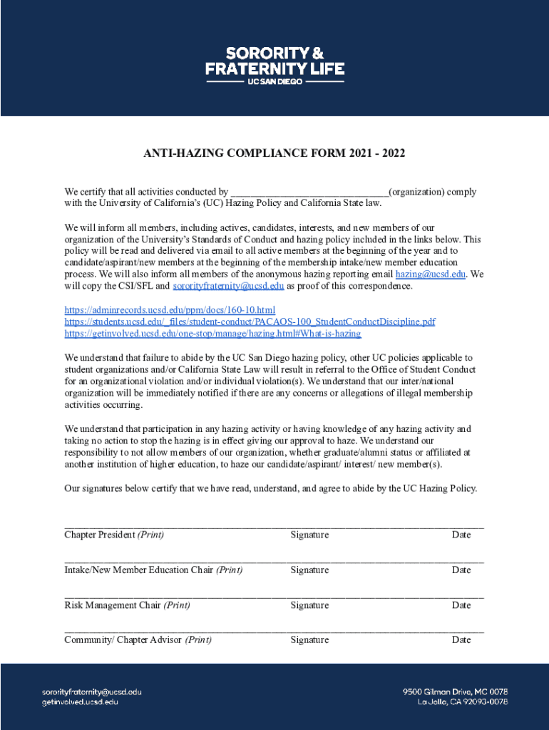 ACTIVATING COMPLIANCE FORM 2021 2022 We certify that all activities conducted by ___(organization) comply with the University of California's (UC) Hazing Policy and California State law. We will inform