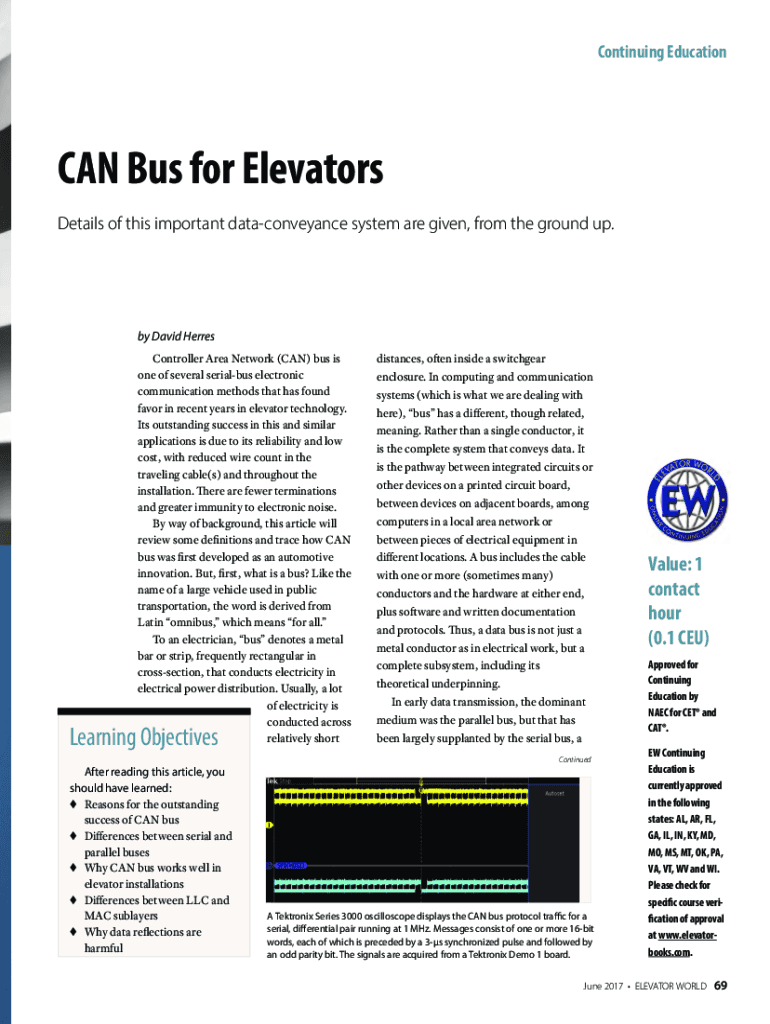 Continuing Education CAN Bus for Elevators Details of this important data conveyance system are given, from the ground up. By David Heroes Controller Area Network (CAN) bus is one of several serial