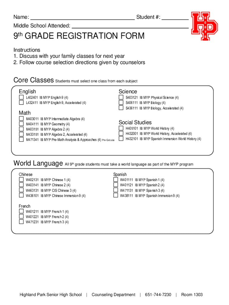 Get the free 9th GRADE REGISTRATION FORM