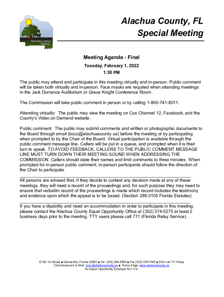 Alachua County, FL Special Meeting Agenda Final Tuesday, February 1, 2022 1:30 PM The public may attend and participate in this meeting virtually and unperson. Public comment will be taken both virtually