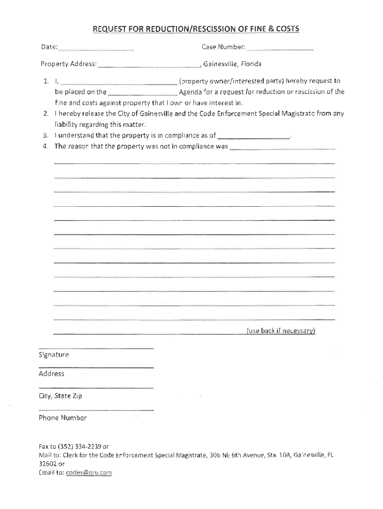 REQUEST FOR REDUCTION/RESCISSION OF FINE & COSTS Date Case Number:Property Address Gainesville, Florida.l, be placed on the(property owner/interested party) hereby request to Agenda for a request