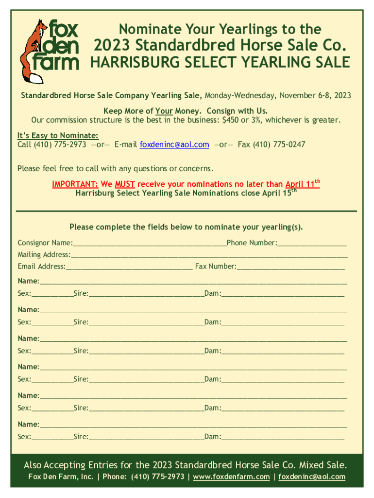 Nominate Your Yearlings to the2023 Standard bred Horse Sale Co. HARRISBURG SELECT YEARLING SALE Standard bred Horse Sale Company Yearling Sale, Monday Wednesday, November 68, 2023 Keep More of Your