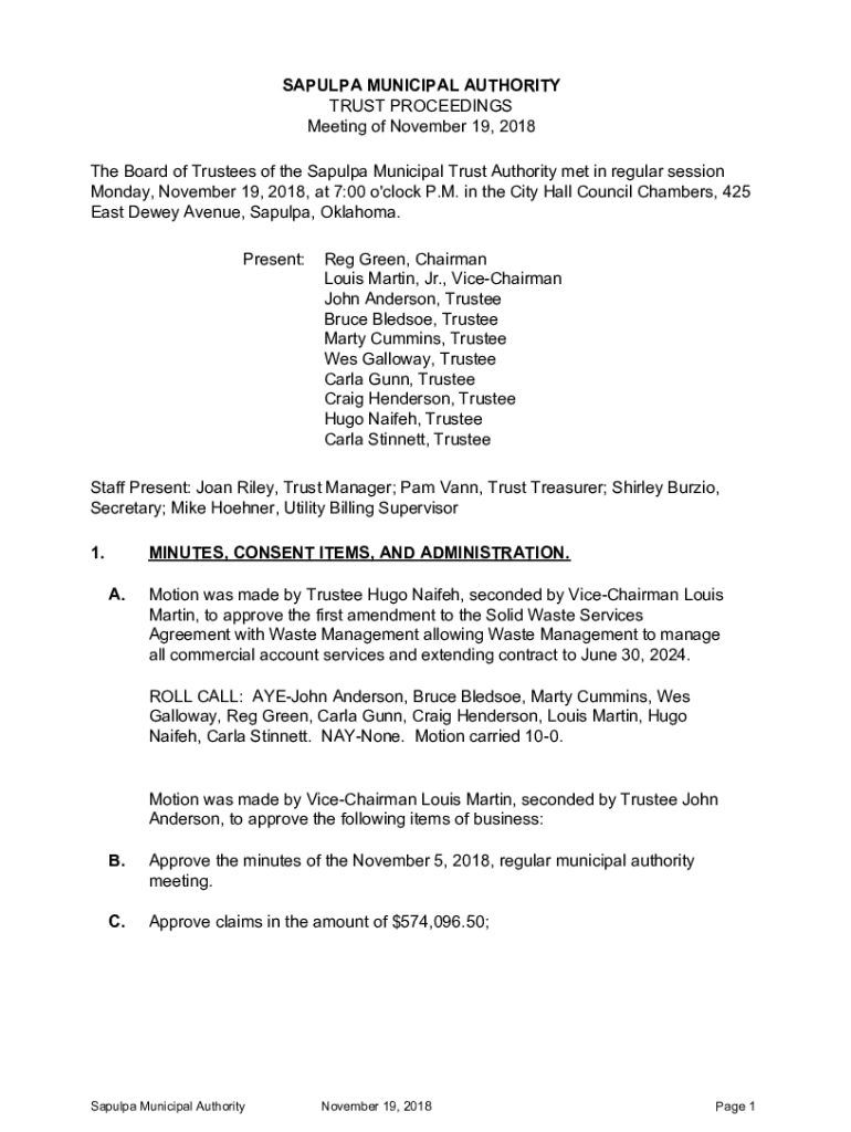 The Board of Trustees of the Sapulpa Municipal Trust Authority met in regular session