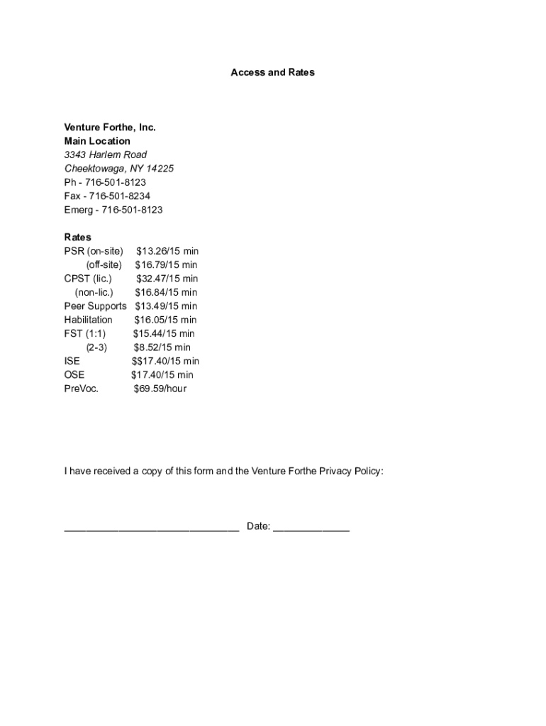 Access and RatesVenture Forth, Inc. Main Location 3343 Harlem Road Cheektowaga, NY 14225 pH 7165018123 Fax 7165018234 Emerge 7165018123 Rates PSR (onsite) (offsite) CAST (LIC.) (Nordic.) Peer Supports