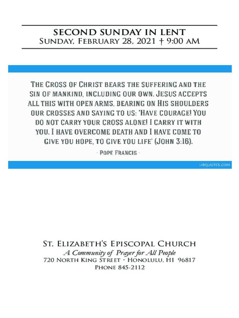 SECOND SUNDAY IN LENT Sunday, February 28, 2021 9:00 AMST. Elizabeth's Episcopal Church