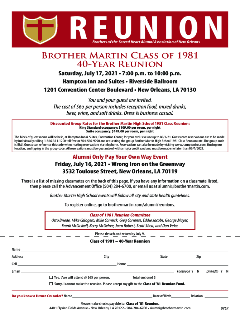 REUNION Brothers of the Sacred Heart Alumni Association of New OrleansBrother Martin Class of 1981 40Year Reunion Saturday, July 17, 2021 7:00 p.m. to 10:00 p.m. Hampton Inn and Suites Riverside Ballroom