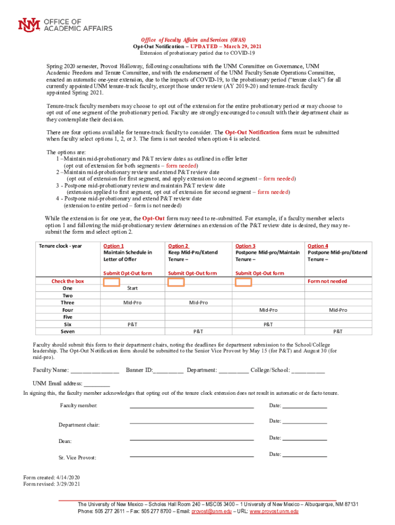 Office of Faculty Affairs and Services (OFFS) Opt-out Notification UPDATED March 29, 2021, Extension of probationary period due to COVID19Spring 2020 semester, Provost Holloway, following consultations